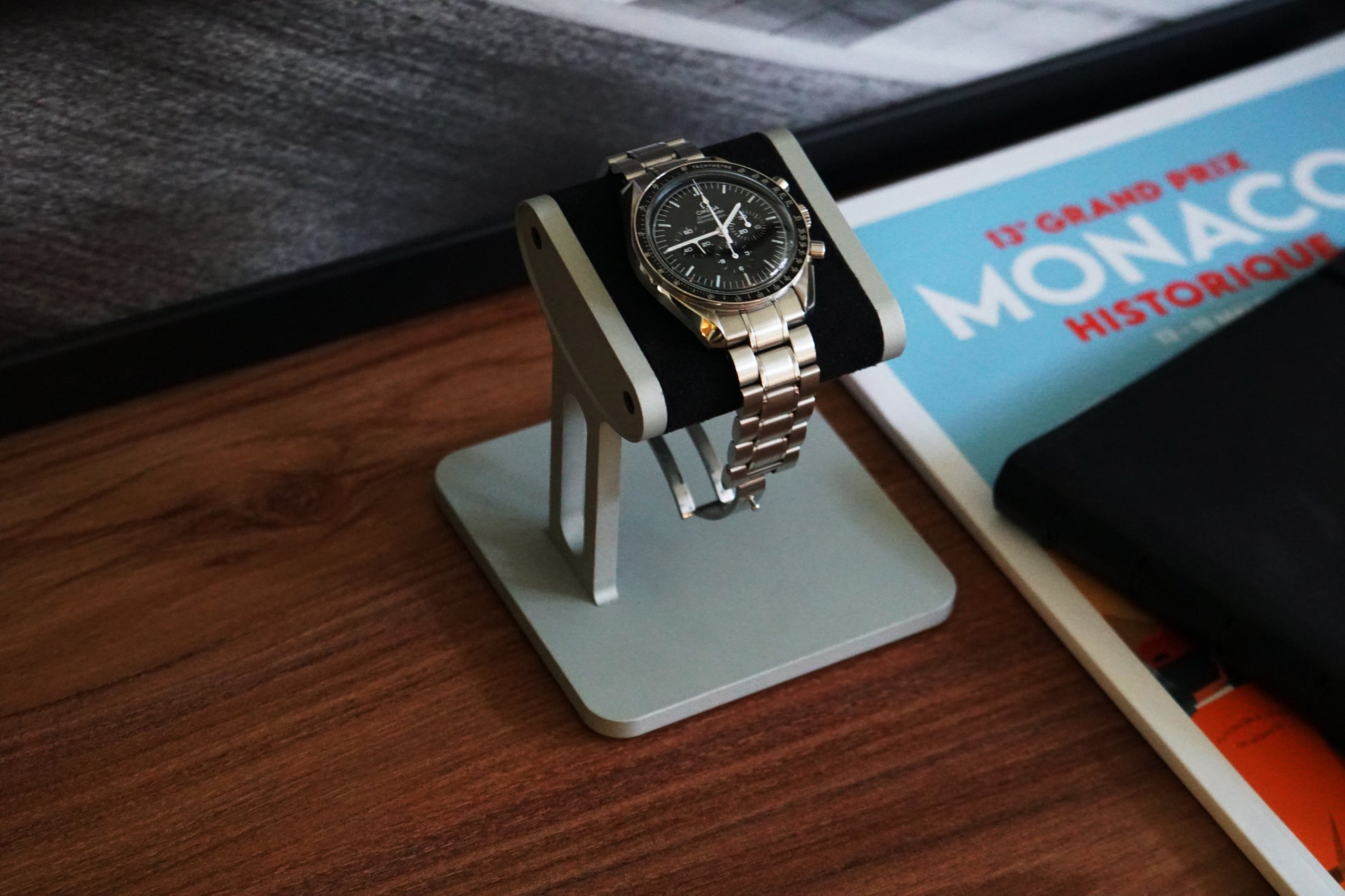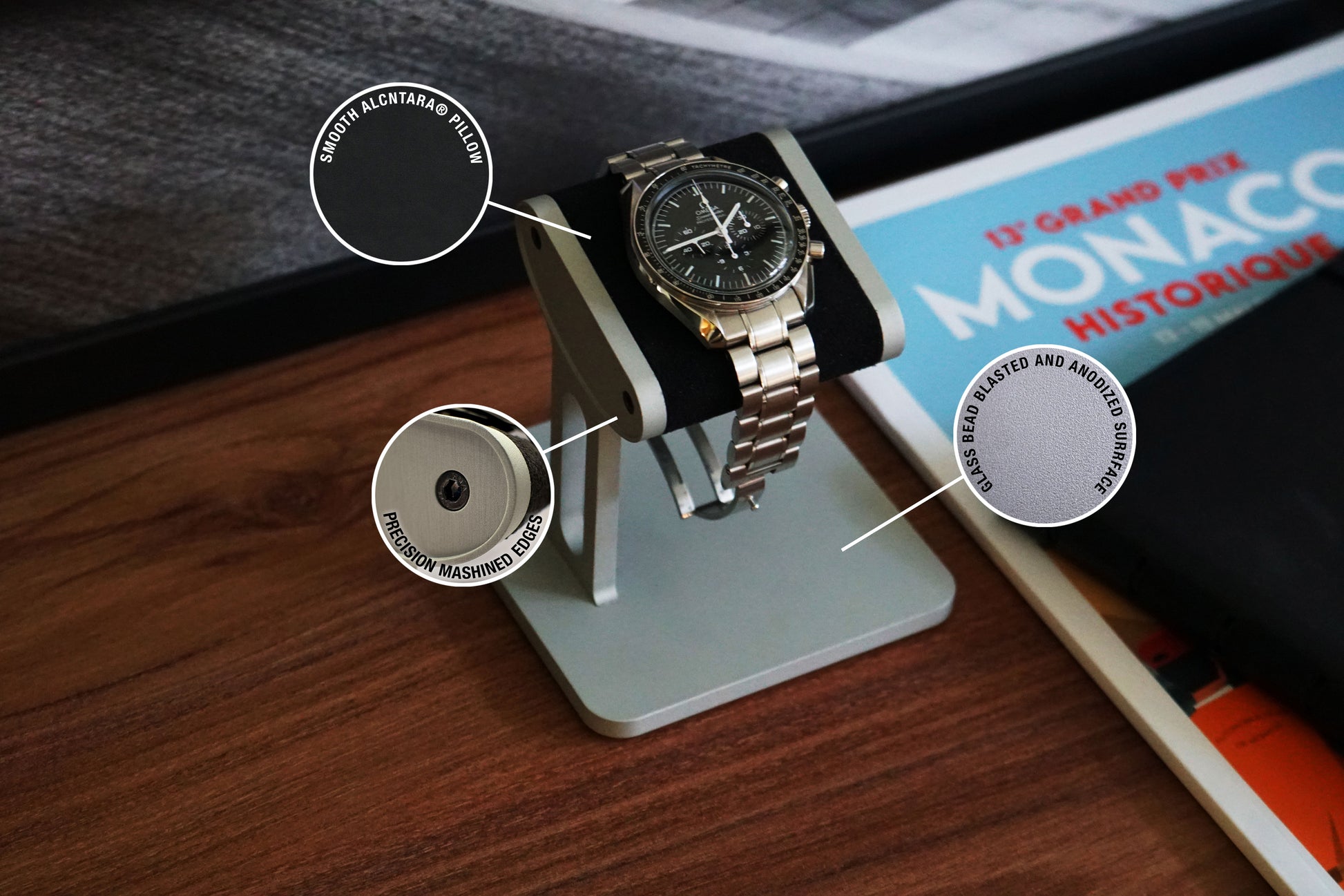 Klockstället är tillverkat av precisionssvarvad aluminium som glasblästrats för en satinmatt yta samt anodiserats för att stå emot slitage. Kudden på stället är täckt i Alcantara, ett material som ofta används till interiörer i exklusiva sportbilar, materialet ger en mjuk yta för klockan att vila på och skapar en balanserad kontrast till det kalla aluminiumet.
